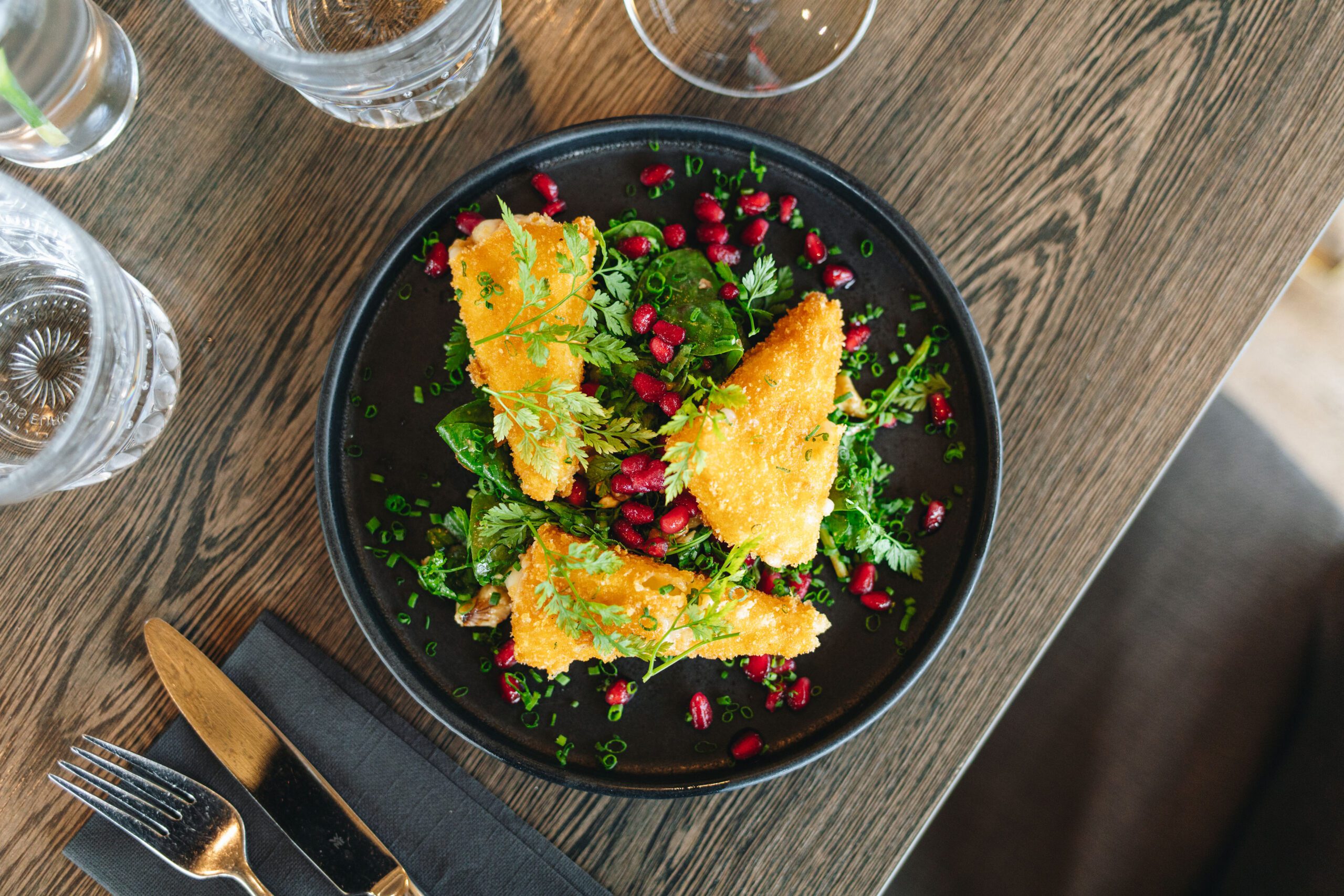Deep-fried manchego cheese, spinach salad and passion vinaigrette, roasted walnuts and pomegranate seeds L, G