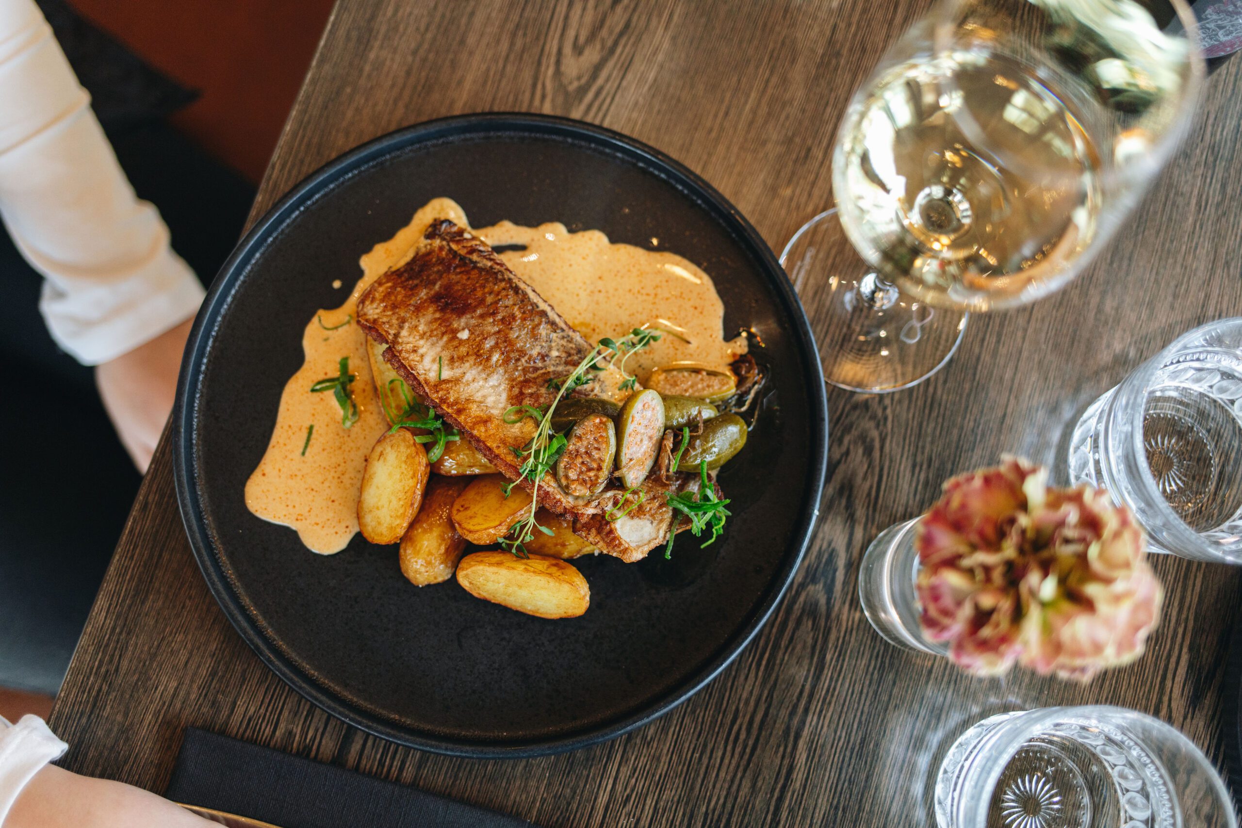 Whitefish fried in butter, lobster cream, roasted potatoes, capers and onions L, G